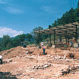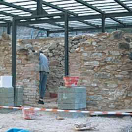 In virtù della consistenza e dello stato di conservazione dei resti rinvenuti nella fase di scavo, i primi interventi predisposti sono consistiti nella rimozione manuale del terriccio, depositato ai piedi delle murature, che celava le tracce di intonaci. Le cortine murarie a sacco sono composte da elementi lapidei e laterizi, con forte eterogeneità geometrica; la parte esterna, oggi priva dell’intonaco, evidenzia l’assenza di ricorsi regolari e l’utilizzo di materiale di spoglio.